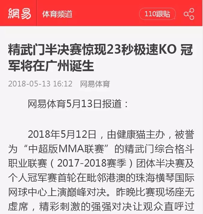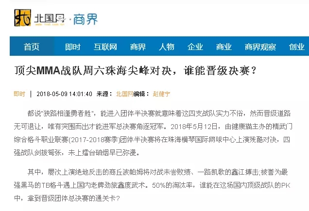 2018年5月12日,精武門綜合格斗職業(yè)聯(lián)賽(2017—2018賽季)團(tuán)體半決賽在珠海橫琴國際網(wǎng)球中心圓滿落幕。鑫江搏擊3:2險勝商丘波帕姆,成功拿到團(tuán)體總決賽的入場券。
