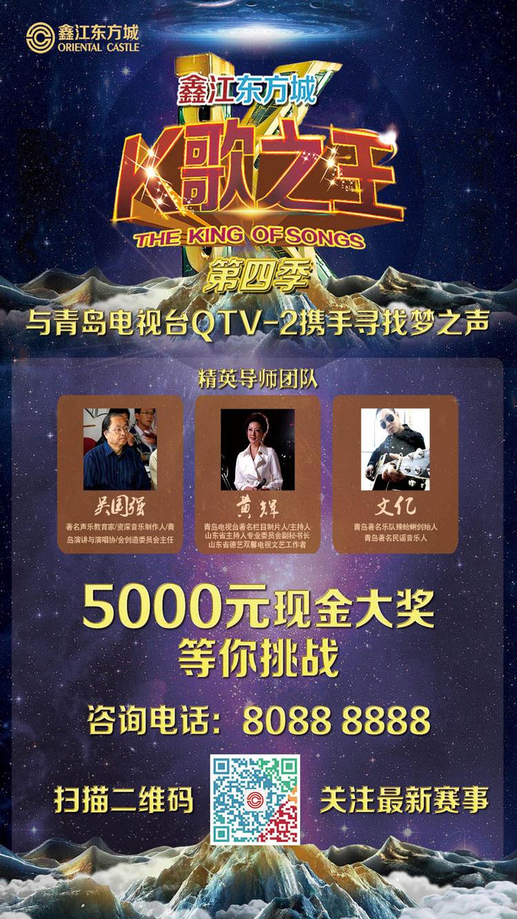 鑫江?東方城攜手QTV-2青島生活服務(wù)頻道共同打造K歌之王第4季,7月8日-9日,激情開唱,著名聲樂教育家吳國強(qiáng)、青島著名節(jié)目主持人黃輝、青島著名辣蛤蜊樂隊(duì)主唱文億三位導(dǎo)師傾情助陣,千位歌者,厲兵秣馬,披荊斬棘!究竟誰會摘得歌王的桂冠,讓我們拭目以待!