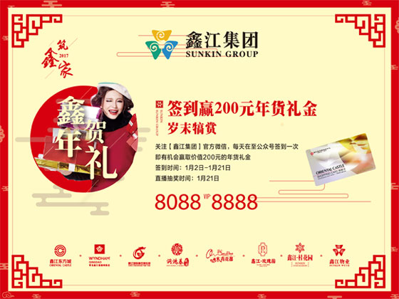 1月2日-1月21日,關注【鑫江集團】微信公眾號,在線報名申請年貨禮金,期間累計簽到十次,即有機會免費參與1月21日,禮金直播抽獎,現場抽出200位獲獎粉絲,每位送出200元年貨禮金!