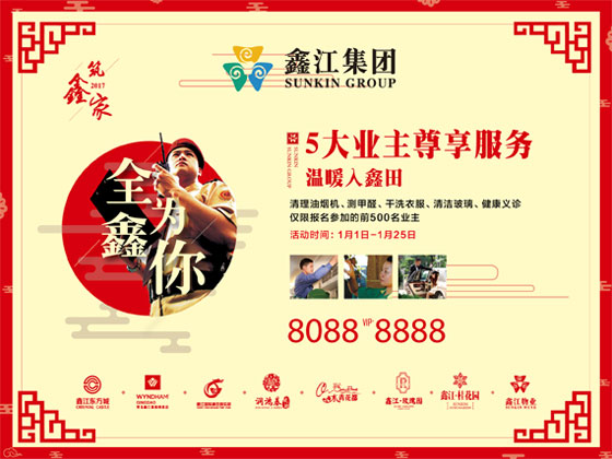 1月1日-1月25日,關注【鑫江集團】微信公眾號,轉發圖文內容,鑫江?拉菲莊園、鑫江?水青木華、鑫江?水青花園業主即有機會領取服務特權卡,免費尊享:健康義診、清理油煙機、測甲醛、洗衣、清潔玻璃,四項內容任選其一。